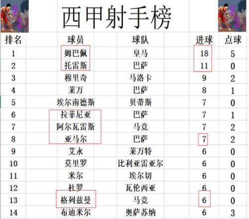 射手榜方面,姆巴佩18球继续稳居榜首,托雷斯今天没有进球,还是11球位列第2。拉菲尼亚点射,亚马尔破门,他们和埃尔南德斯追上阿尔瓦雷斯,四人7球并列第5。格列兹曼打入一球后,则是追上杜罗,莫里罗等人6球刚好挤入前十。